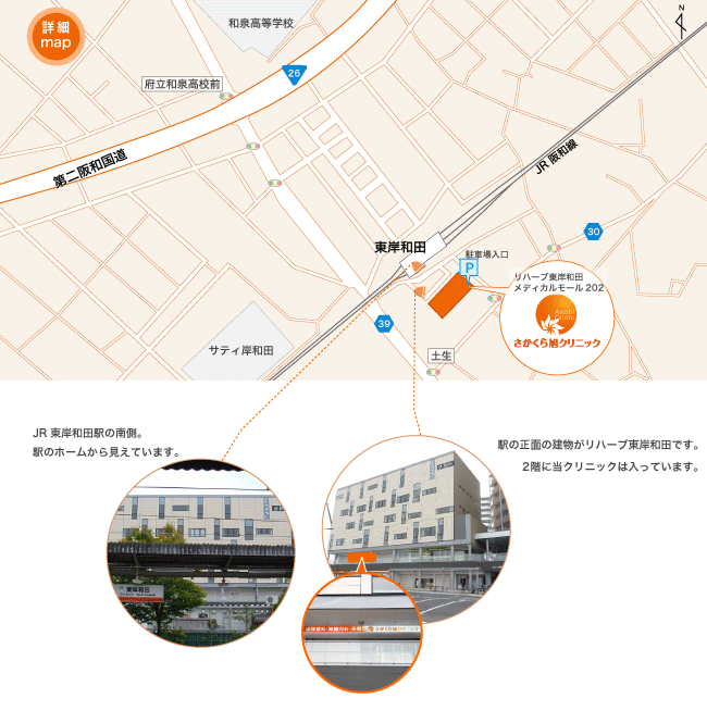 JR 阪和線 東岸和田駅前 改札出口よりすぐ。